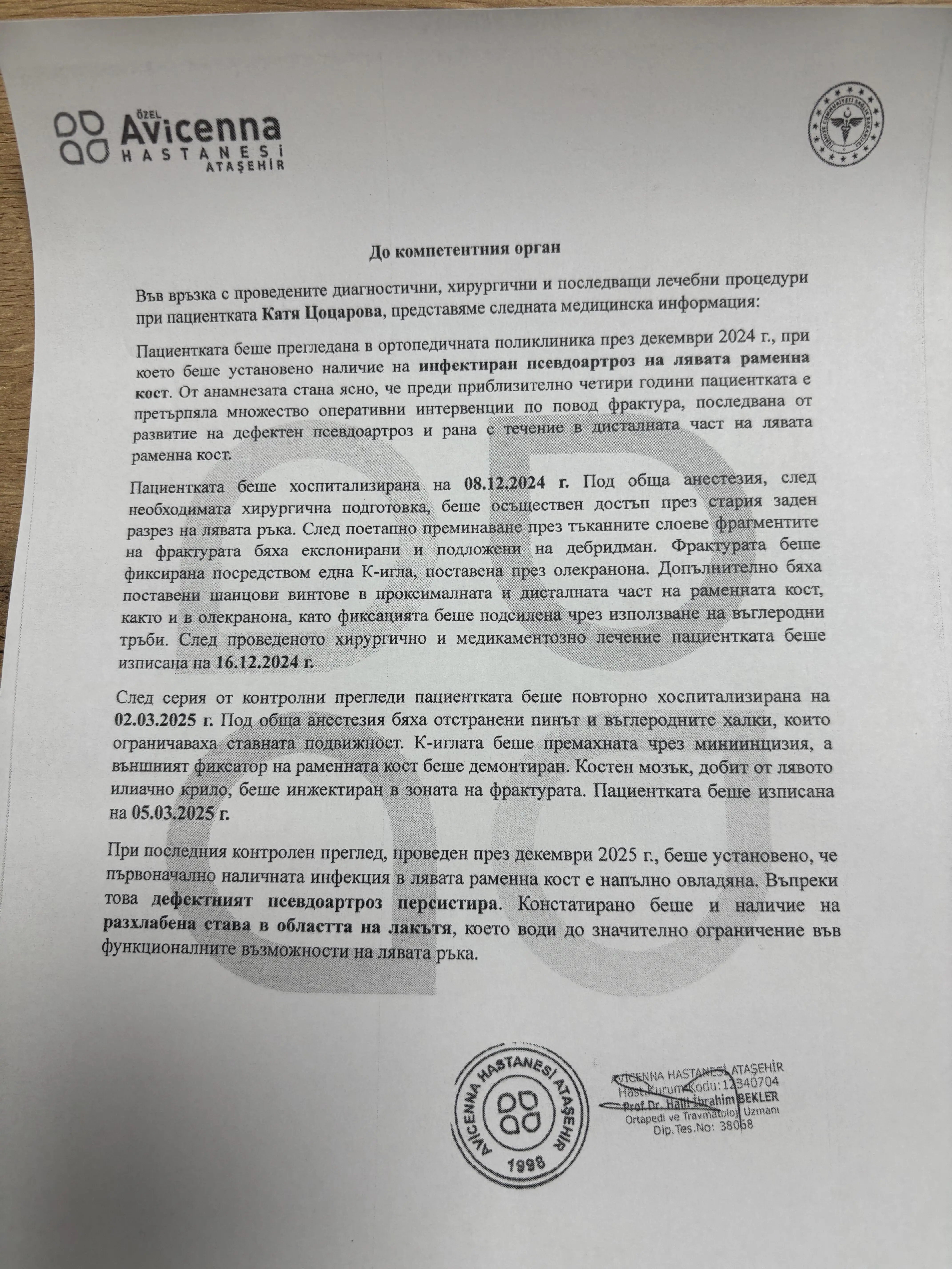 След серия контролни прегледи, на 02.03.2025 г. отново бе приета в болницата за премахване на поставени игли и фиксатори.