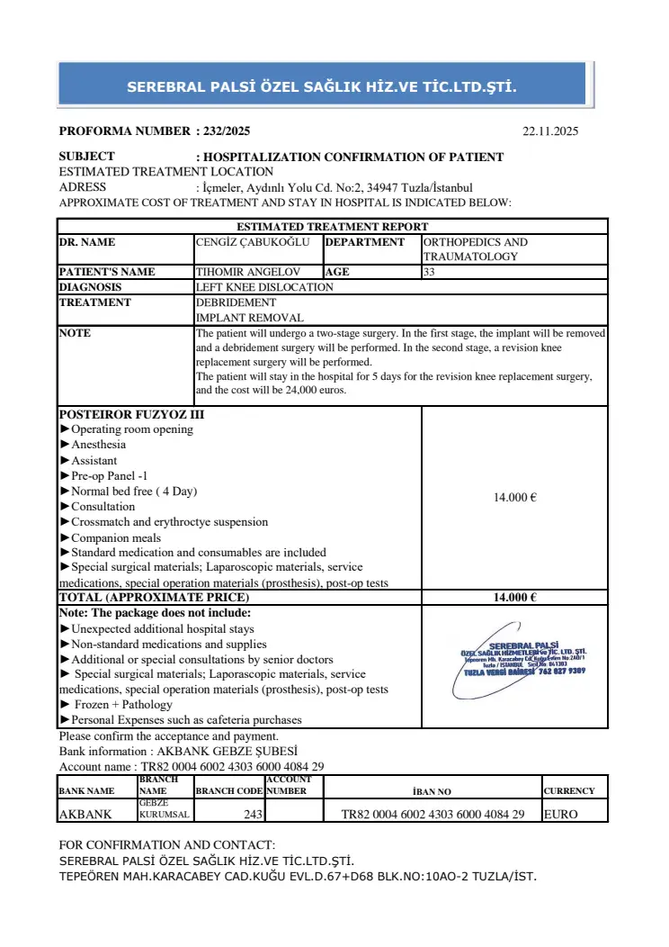 За жалост болницата в Германия, която по-рано изпрати оферта за лечението ми в размер на над 60 хил. евро, в последствие се отказа да извърши лечението с формуляр S2. Единственият шанс към момента е да осъществя лечението в клиника в Турция. От там вече имаме оферта за малко над 36 хил. евро. Предложението е валидно до края на месец март. Затова разчитам на Вашата помощ!