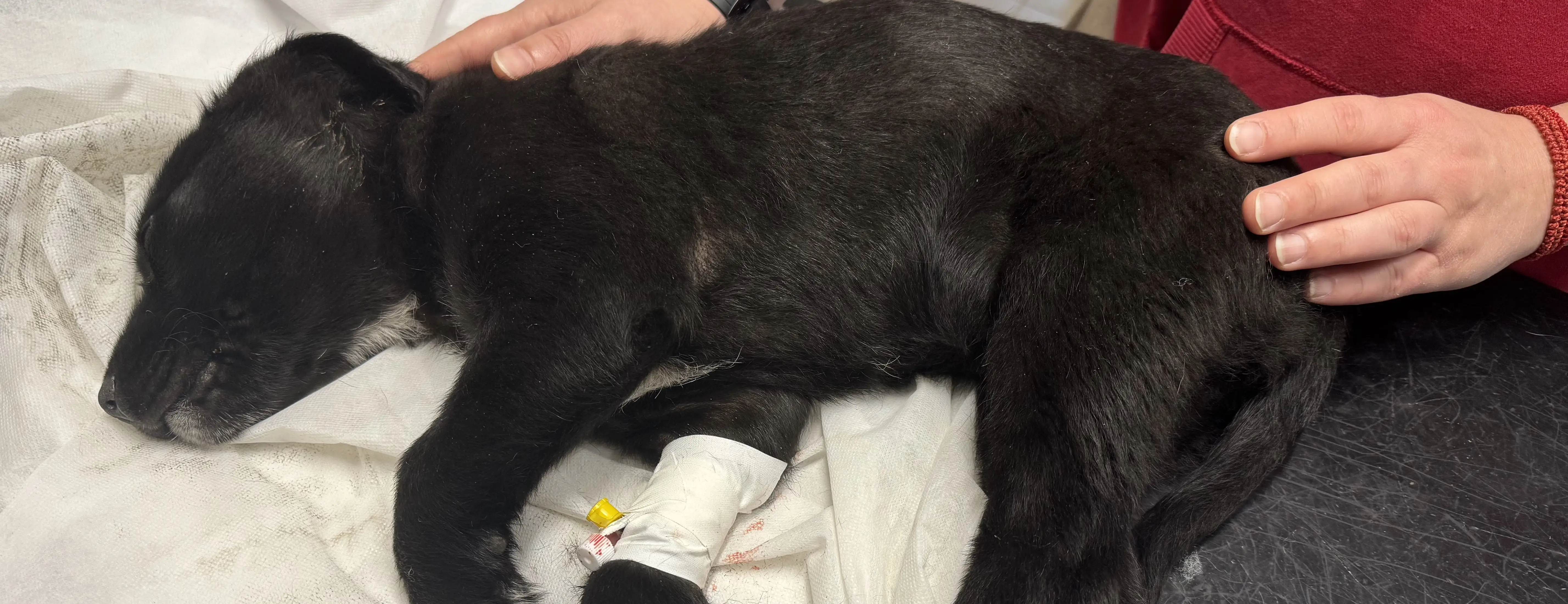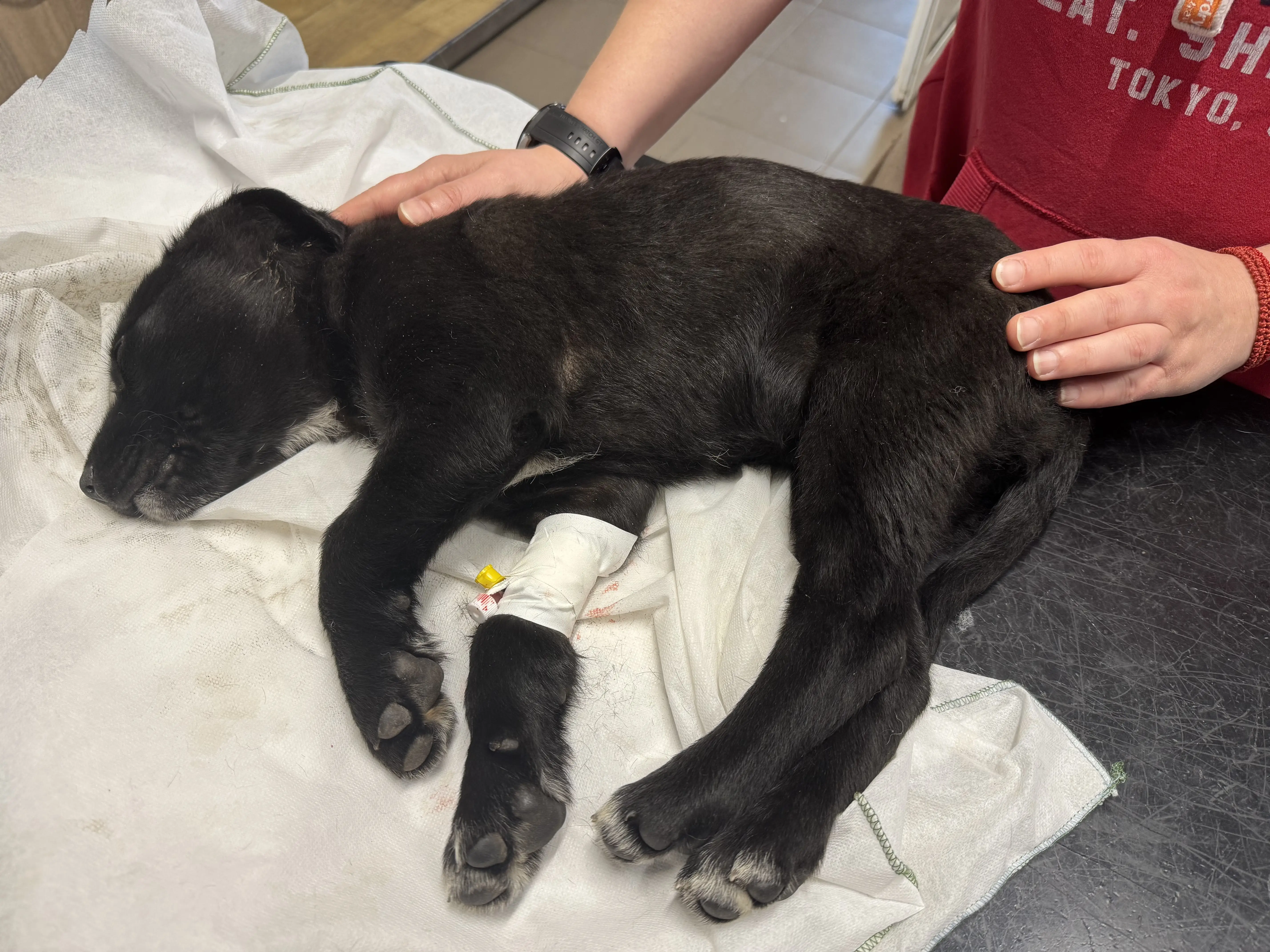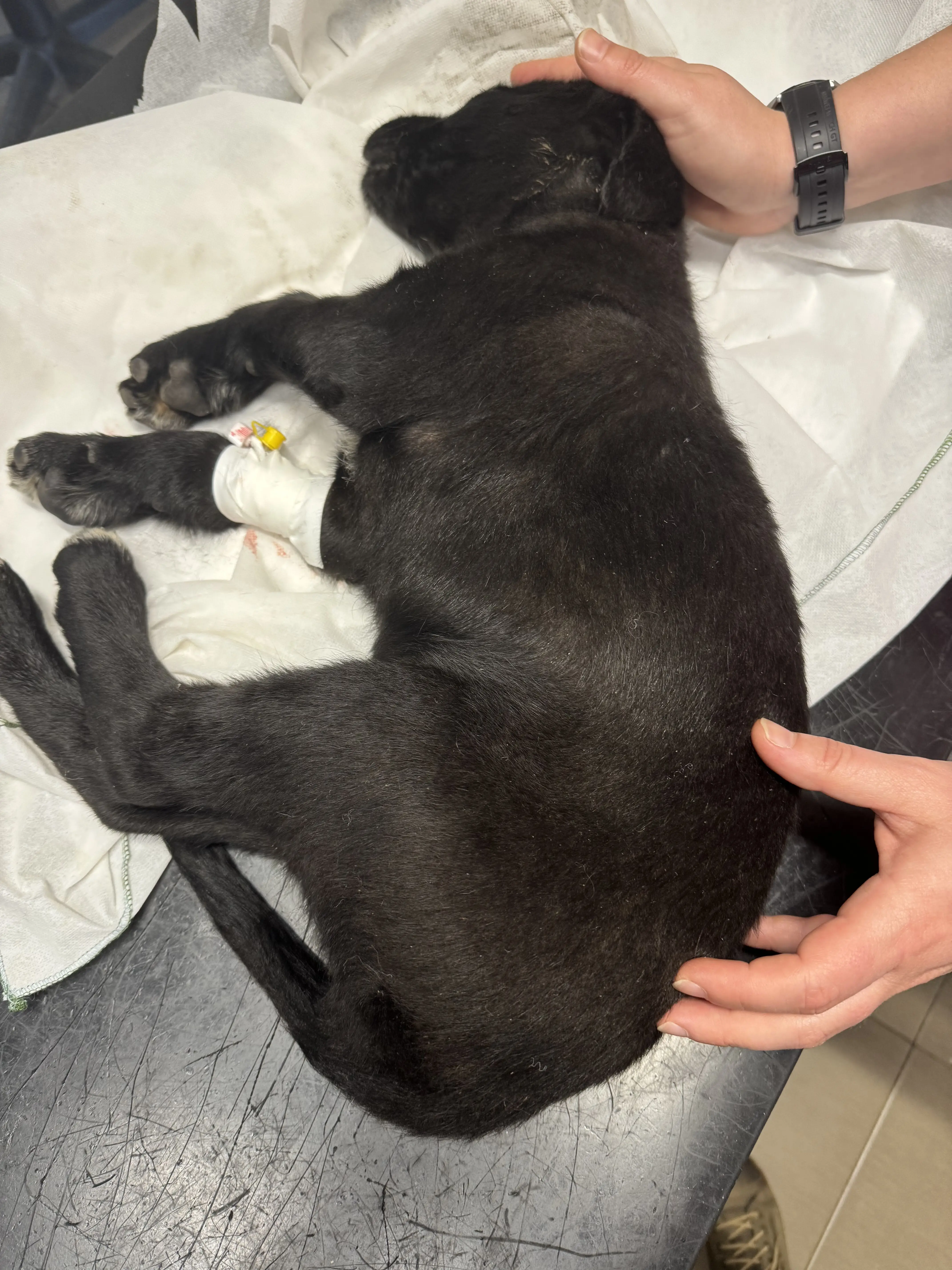 Вчера открихме Скай в шоково състояние. Не знаем със сигурност какво се е случило – дали е блъсната от кола, или по-лошото – дали е станала жертва на човешка жестокост и е била ритната. Резултатът обаче е съкрушителен: тежко счупена предна лапа в областта на рамото и кръвоизлив в главата.