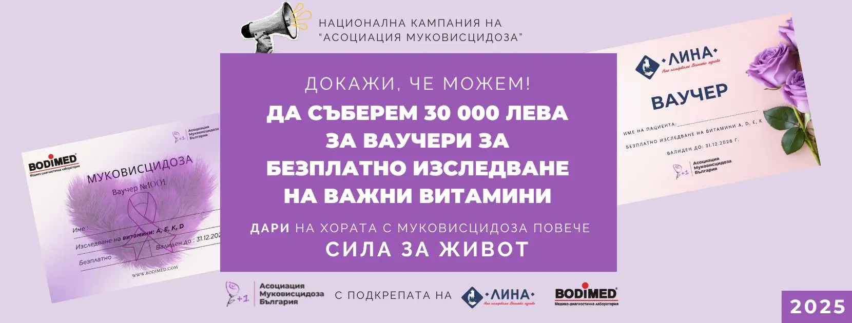 Ние - Асоциация Муковисцидоза , започваме дарителска кампания за набиране на средства за закупване на ваучери за изследвания на мастноразтворимите витамини, които ще раздаваме безплатно на всеки пациент с това заболяване .