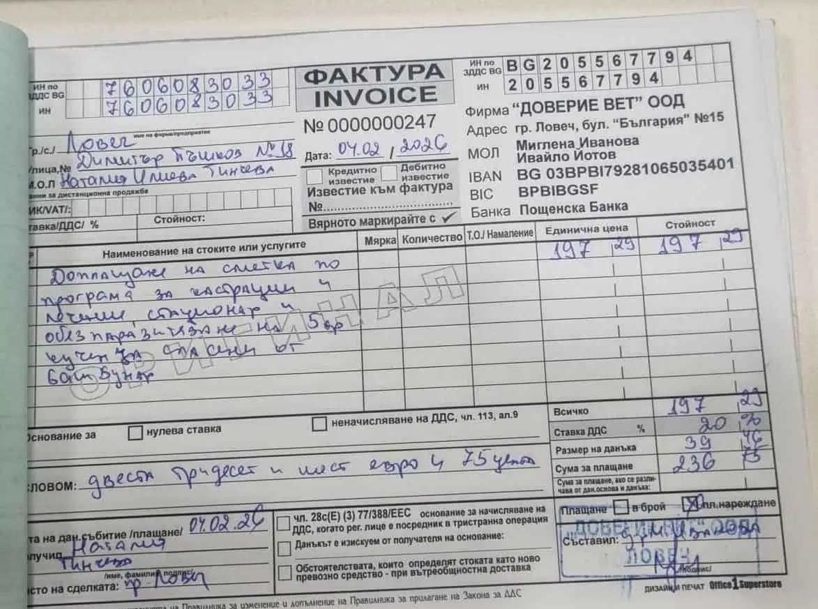 Изтеглената сума от 181,35 € ще бъде използвана за заплащане на част от приложената фактура за 236,75 € (виж снимката) от Ветеринарен център „Доверие“ в Ловеч. Там наскоро бяха прибрани 5 бебета кученца, изоставени в дънера на дърво в парк БашБънар в Ловеч 🐾 Две от тях все още са в клиниката, а сметката ще се увеличи с първата и втората ваксинации и лечения.