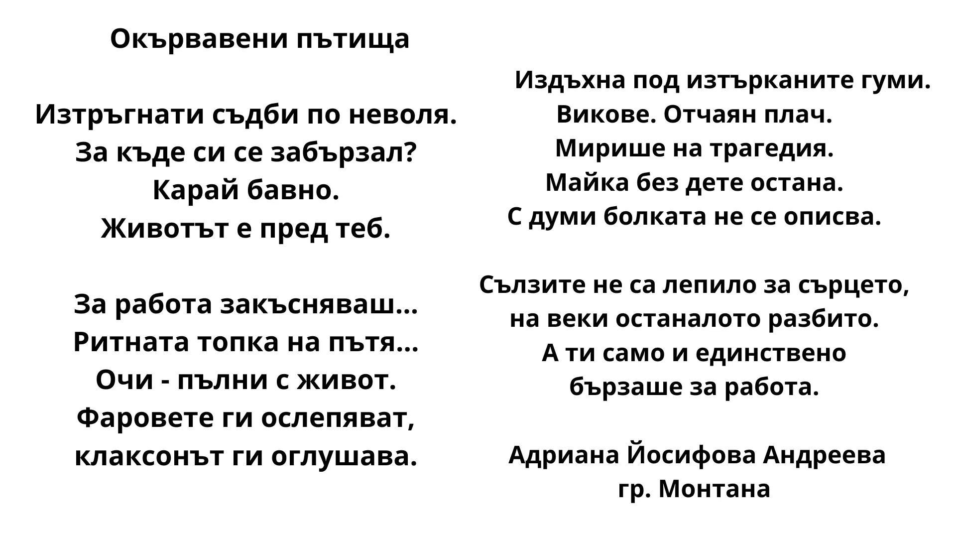 В рамките на кампанията получихме голям брой поетични творби от деца от цяла България-искрени, чисти и болезнено истински, посветени на близки, приятели и познати, загинали нелепо на пътя. Кампанията е акт на памет, съпричастност и гражданска позиция.
