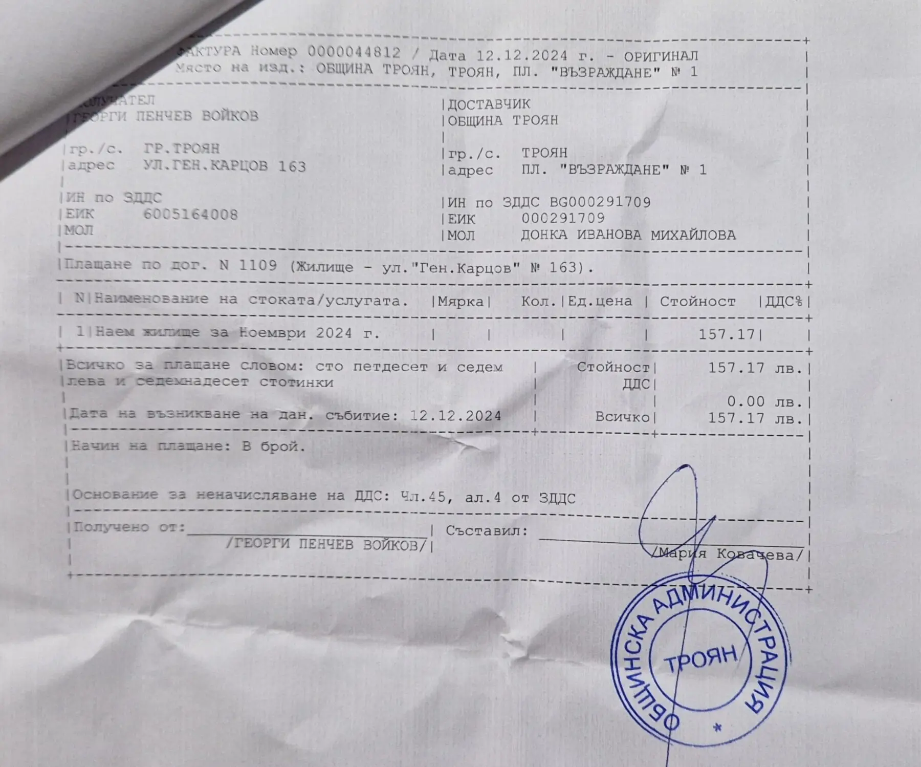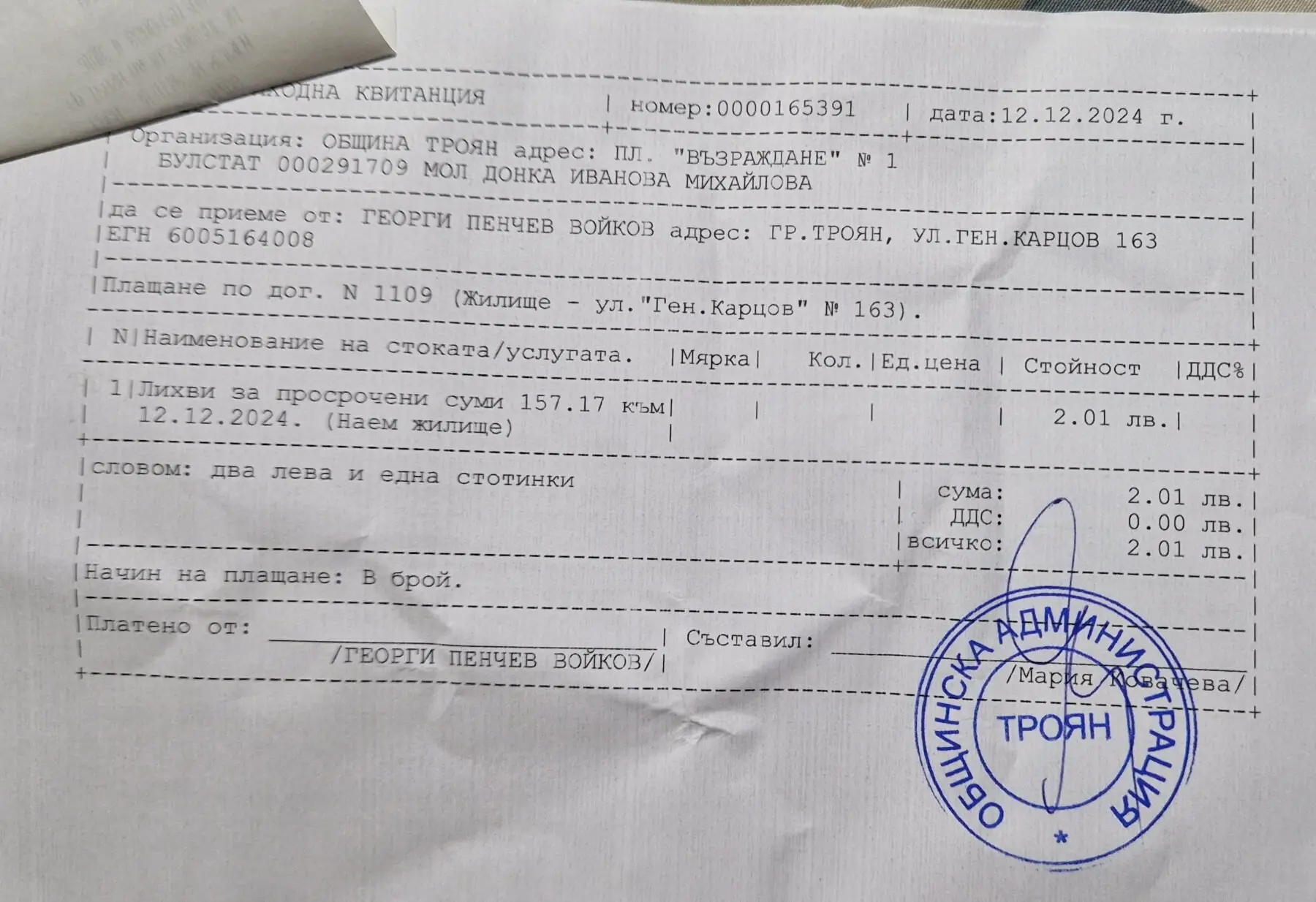 Платен наем на общинското жилище благодарим ви !