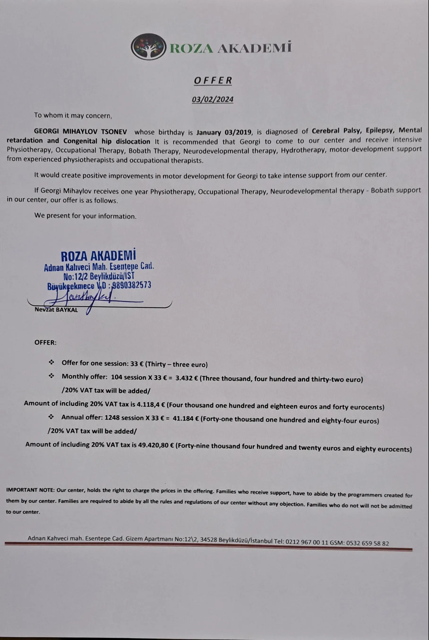 Here, we now have an offer from Rosa Akademi Rehabilitation Center in Istanbul for the cost of the rehabilitation Gogo needs for 1 year.