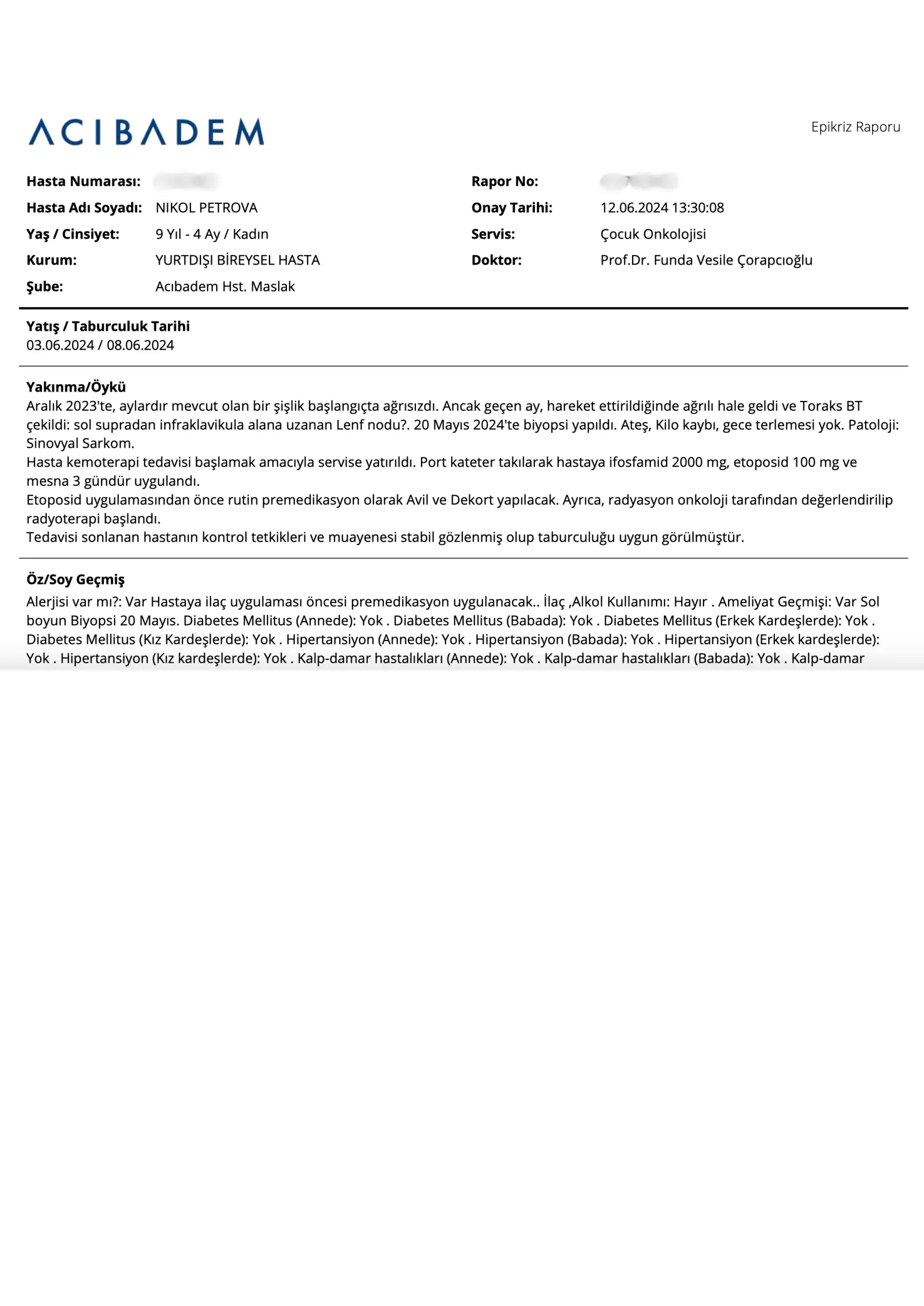 Fortunately, her condition has been stabilized and radiation therapy is continuing as planned. An epicrisis was issued by the Turkish hospital stating that Nicole was suffering from Synovial Sarcoma, a rare and aggressive type of cancer that develops in the soft tissue around the joints.