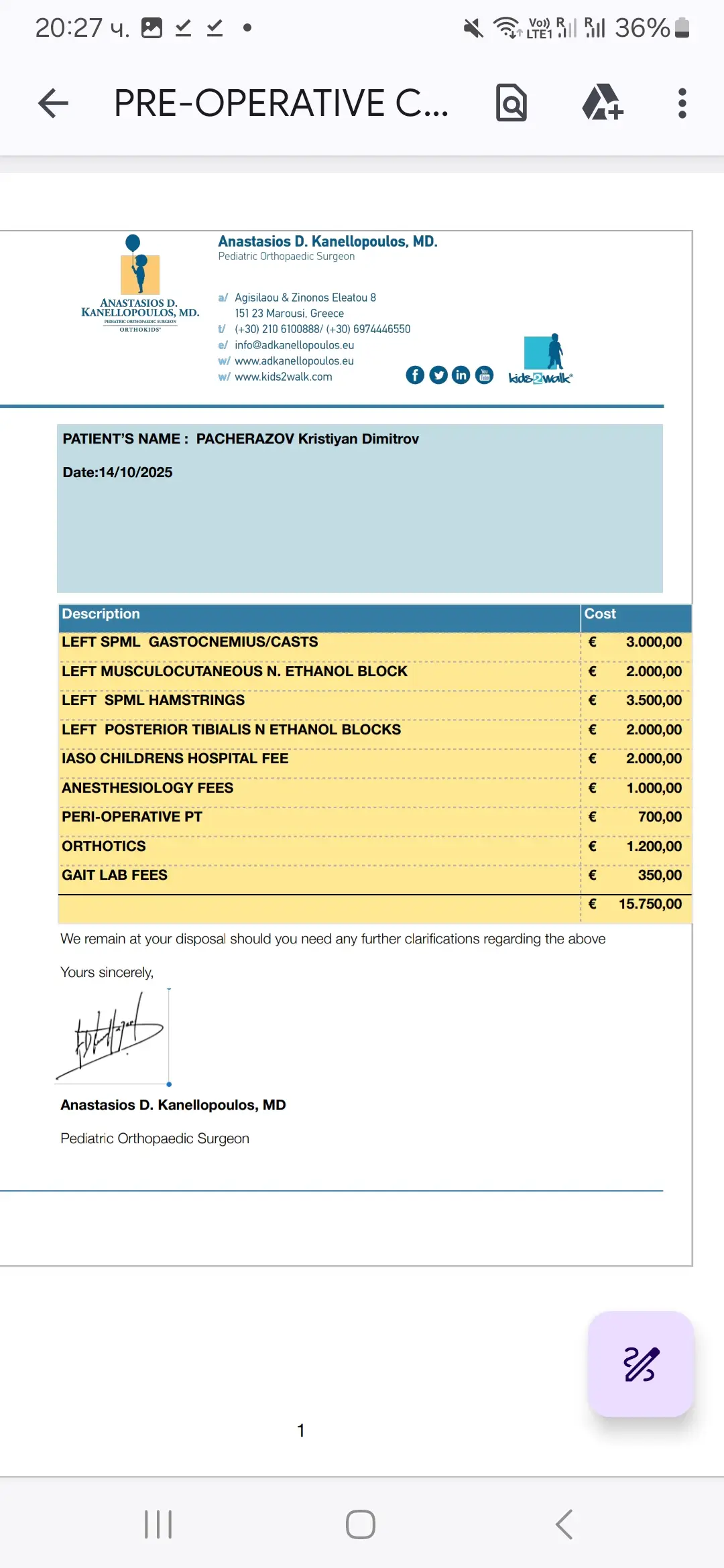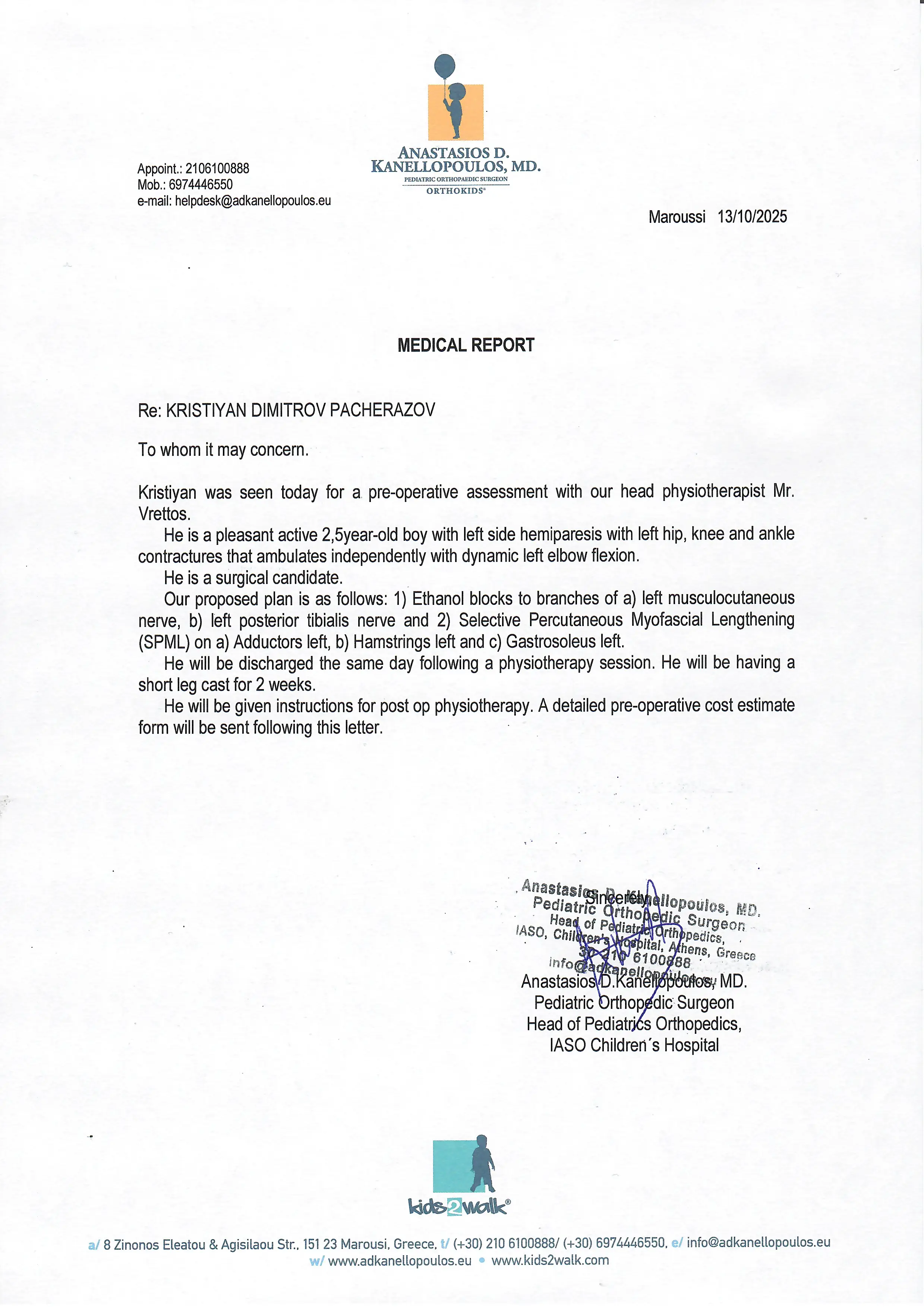 On 13.10.2025, Dr. Anastasios Kanellopoulos - pediatric orthopedic surgeon and head of the Department of Pediatric Orthopedics at IASO Children's Hospital (Athens, Greece), performed a pre-operative examination of Kristian Dimitrov Pacherazov.