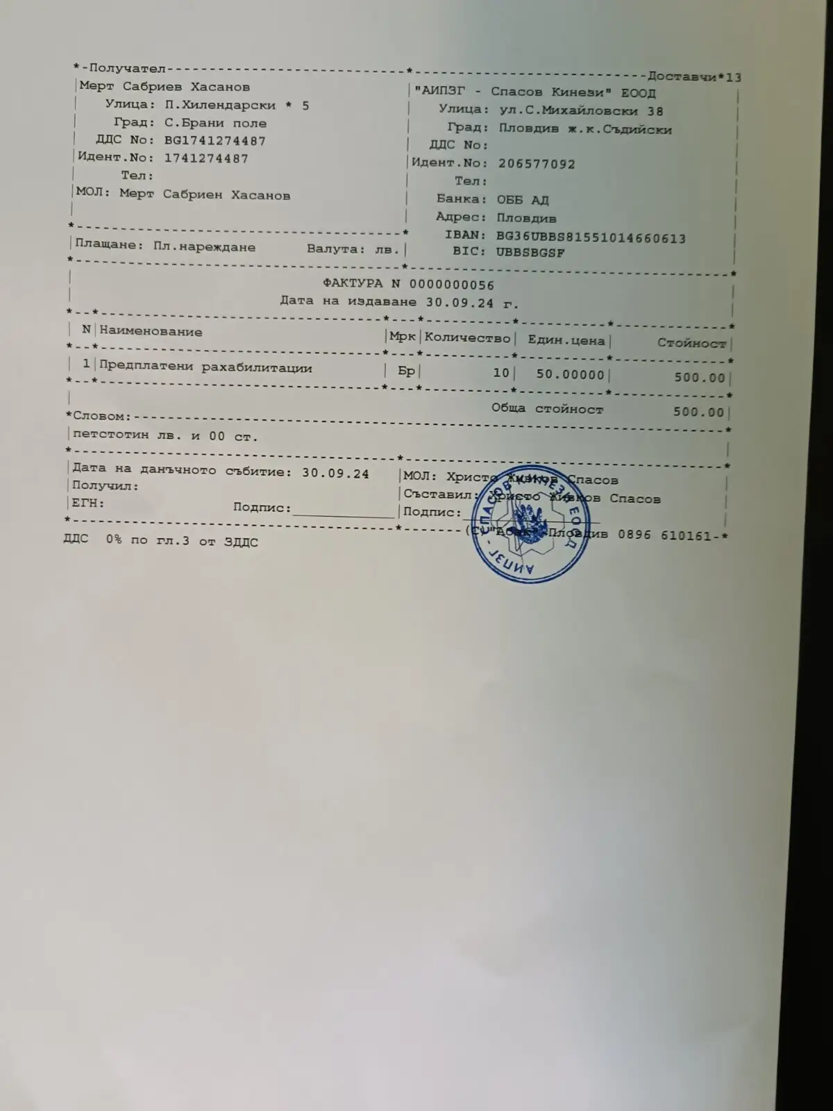 Направено плащането по фактура за рехабилитация за лечение на Мерт