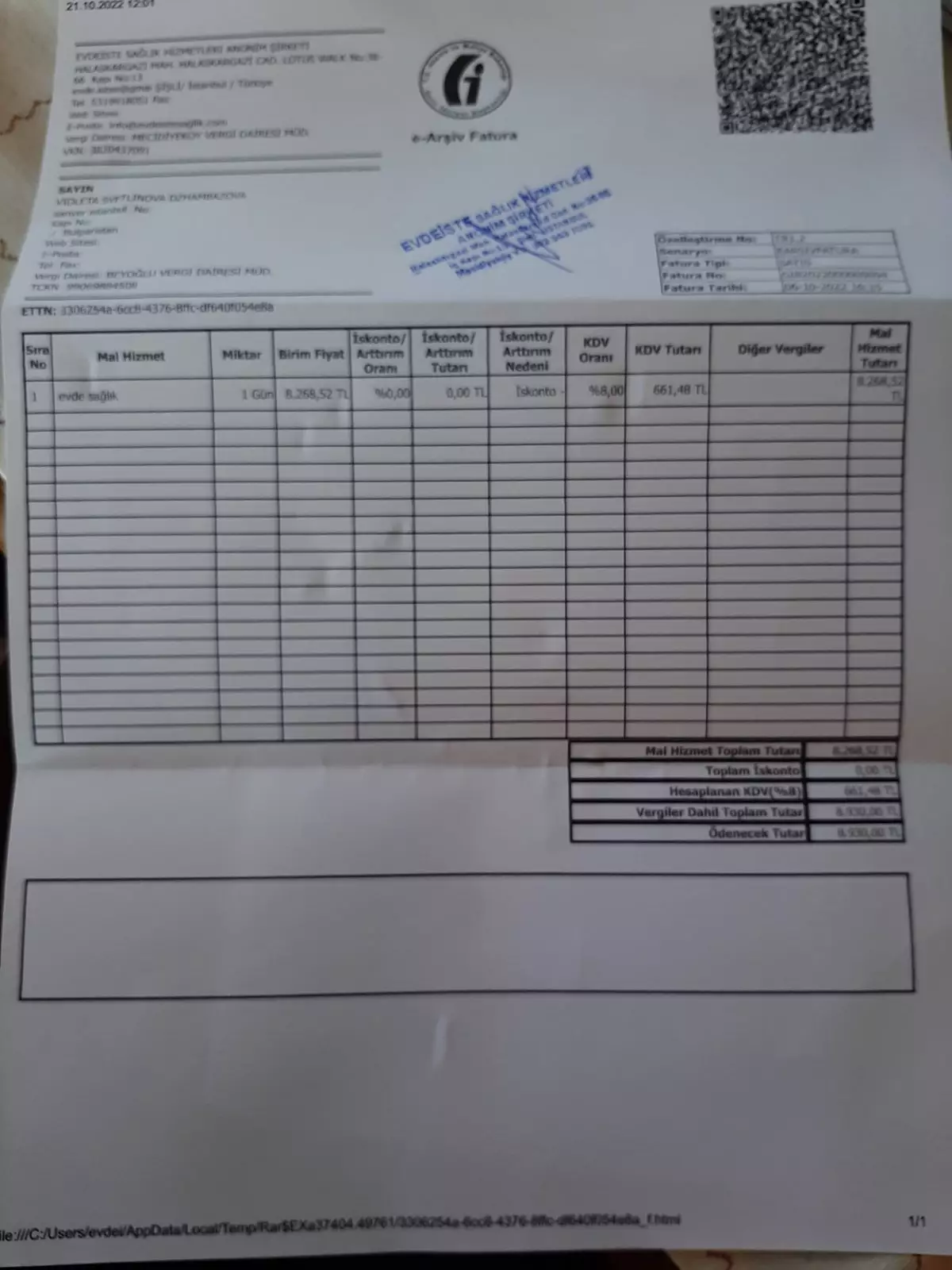 1 300 TL - bed rental + gas cylinder + blood tests