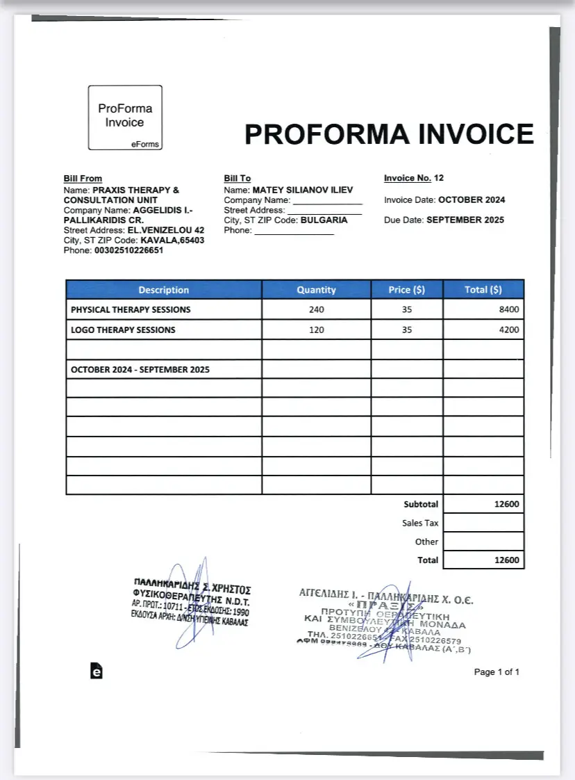 First of all I want to thank you for your overwhelming support🙏 without you we wouldn't have gotten here. We are continuing rehab in Greece -Kavala.Matthew is doing чудесно❤️🙏❤️свикна with the cats and walking with a smile. I am attaching proforma invoices for one year for rehab,speech therapist and hotel.Thank you for being there and not stopping to help us and подкрепяте❤️🙏❤️