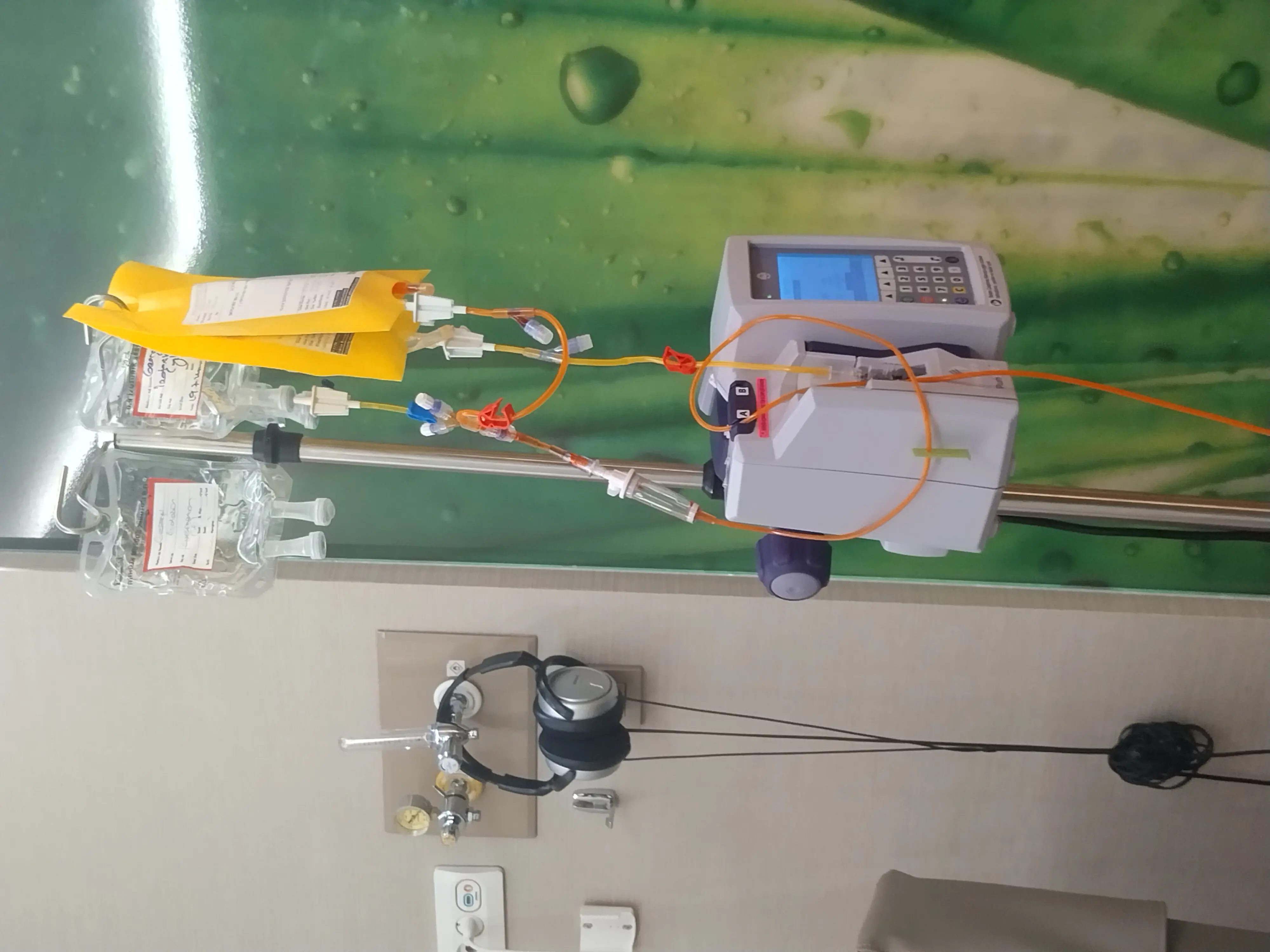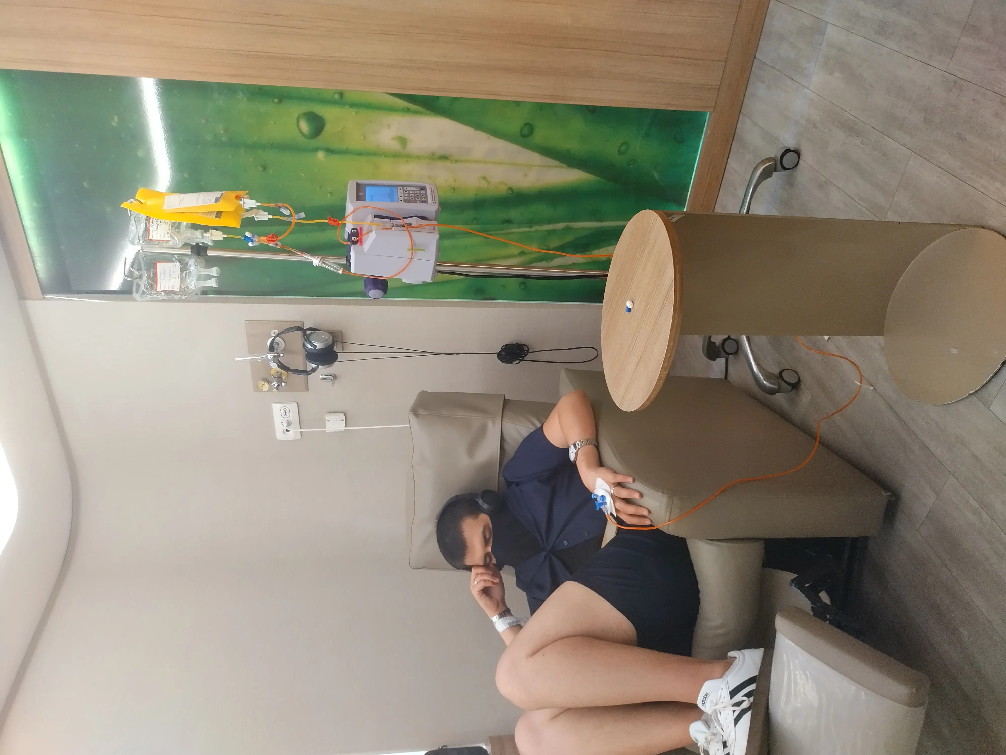 At the end of the fifth chemotherapy, George feels fine. The check up with Dr Tavil went well, she is very pleased with five scans and blood counts we continue to fight , two more infusions left and then 10 radiotherapy. We will continue with the blood thinning injection because the vein that got inflamed on the fourth chemo is still swollen and sensitive, we will also continue with the meds she prescribed for the side effects. He has lost a little weight and we need to get the weight back. He is very sensitive to any smells especially here in the chemo room, he has a nose and mouth lighter for that.